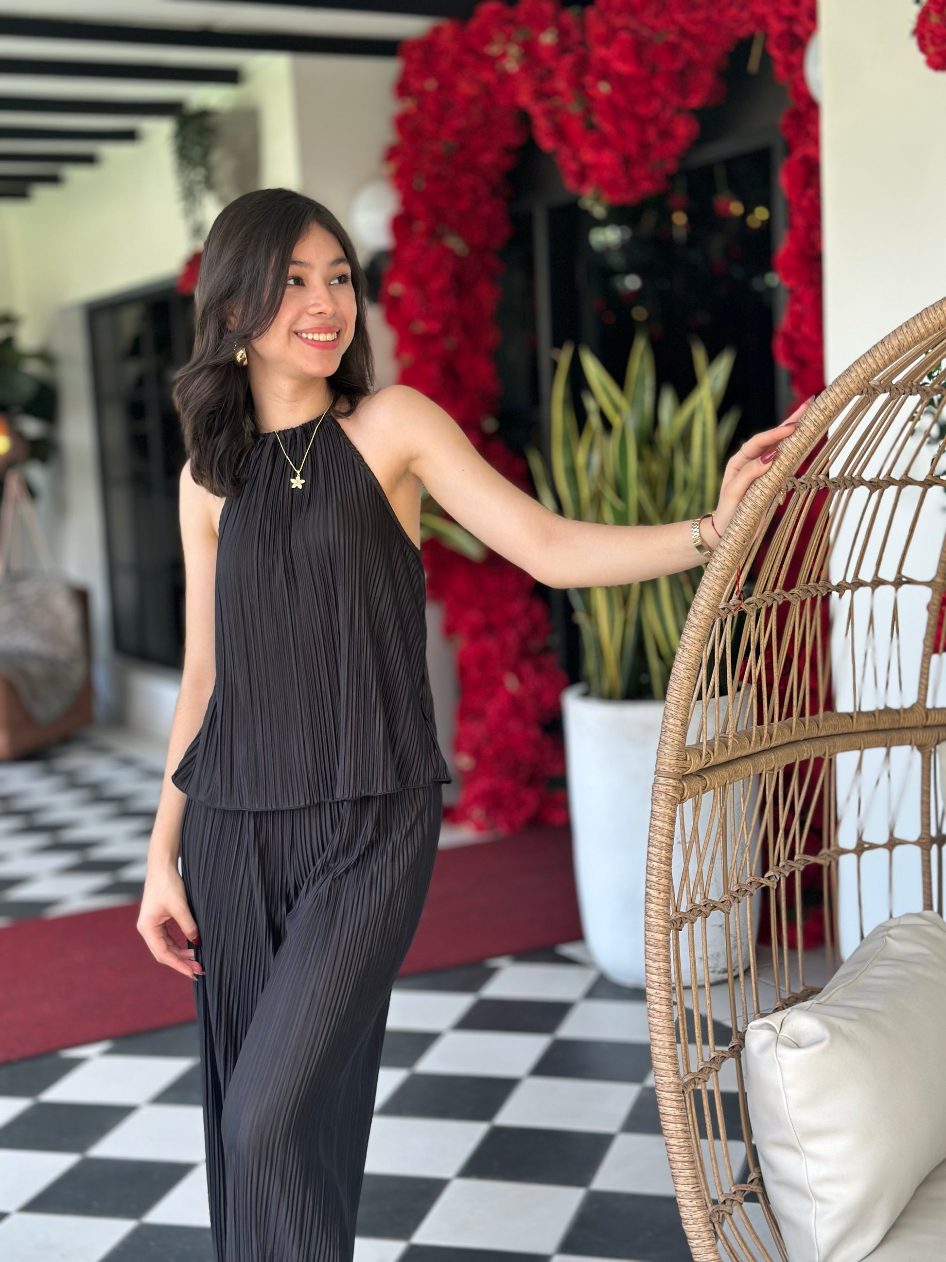 Siente la elegancia y el lujo con nuestro Conjunto de dos piezas. El top halter de un solo color resalta tu figura, mientras que los pantalones de pierna ancha en negro añaden un toque de sofisticación. Demuestra tu estilo exclusivo con esta combinación perfecta.