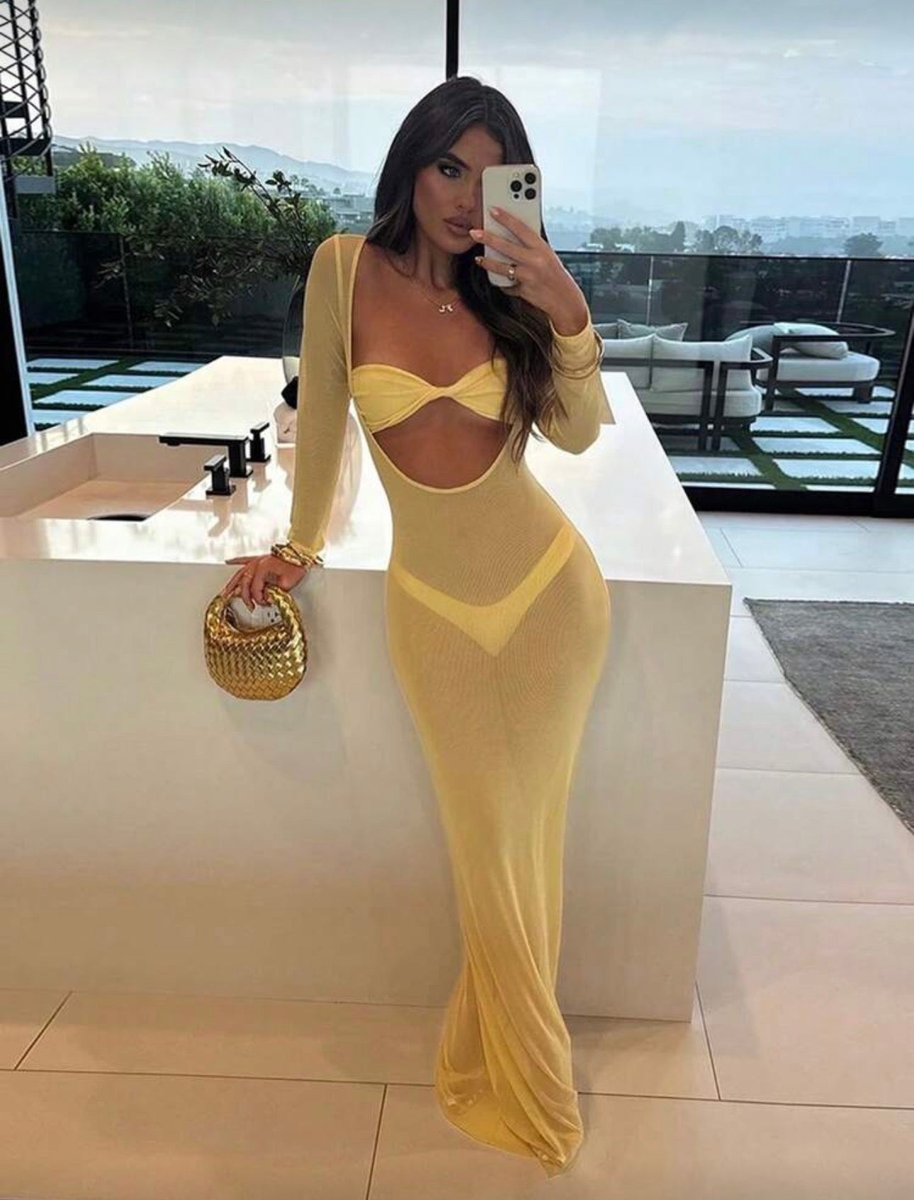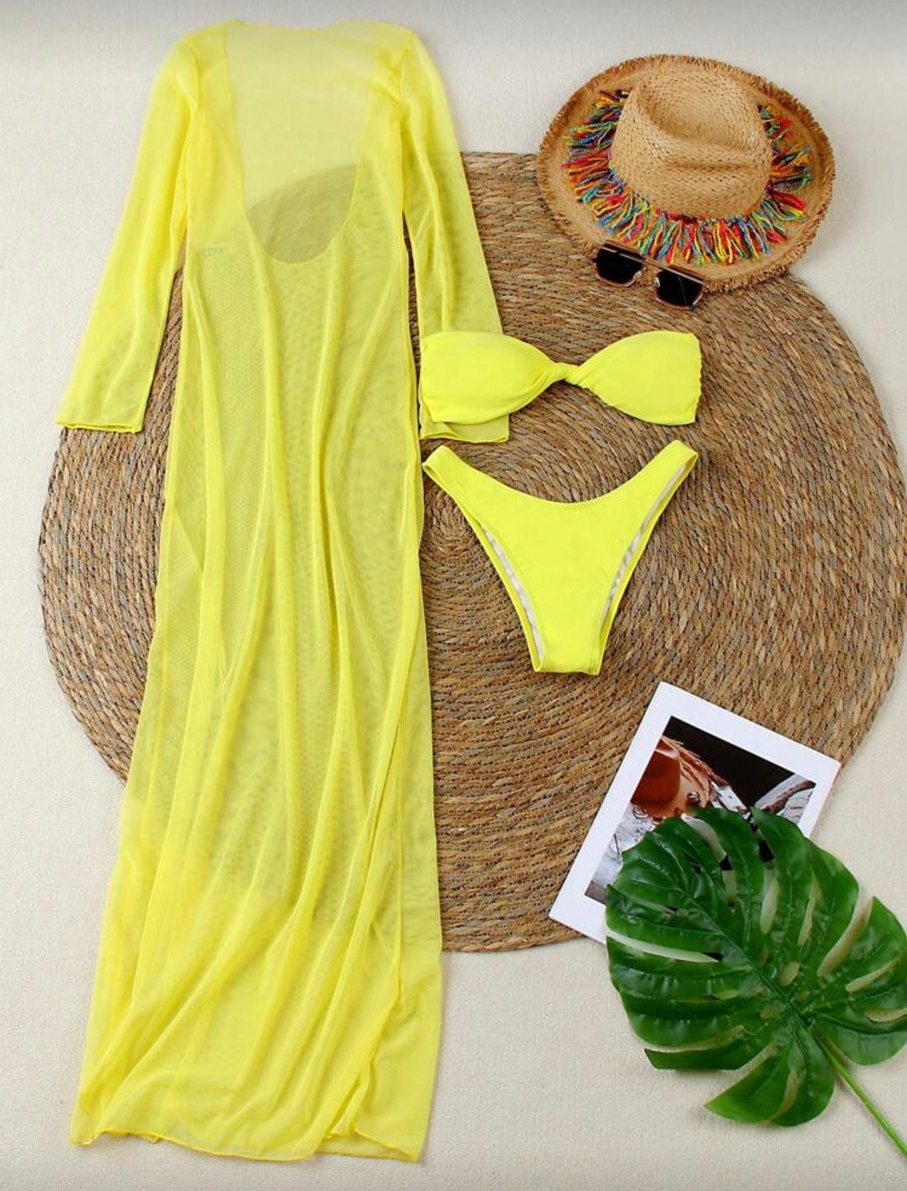 Un sofisticado traje de baño de tres piezas en un cautivador tono amarillo solar ☀️💛, diseñado para resaltar la silueta con elegancia y distinción. El top de escote fruncido realza el busto de forma delicada y femenina, mientras que la pieza inferior estiliza la figura con un ajuste armonioso que abraza el cuerpo con suavidad ✨.